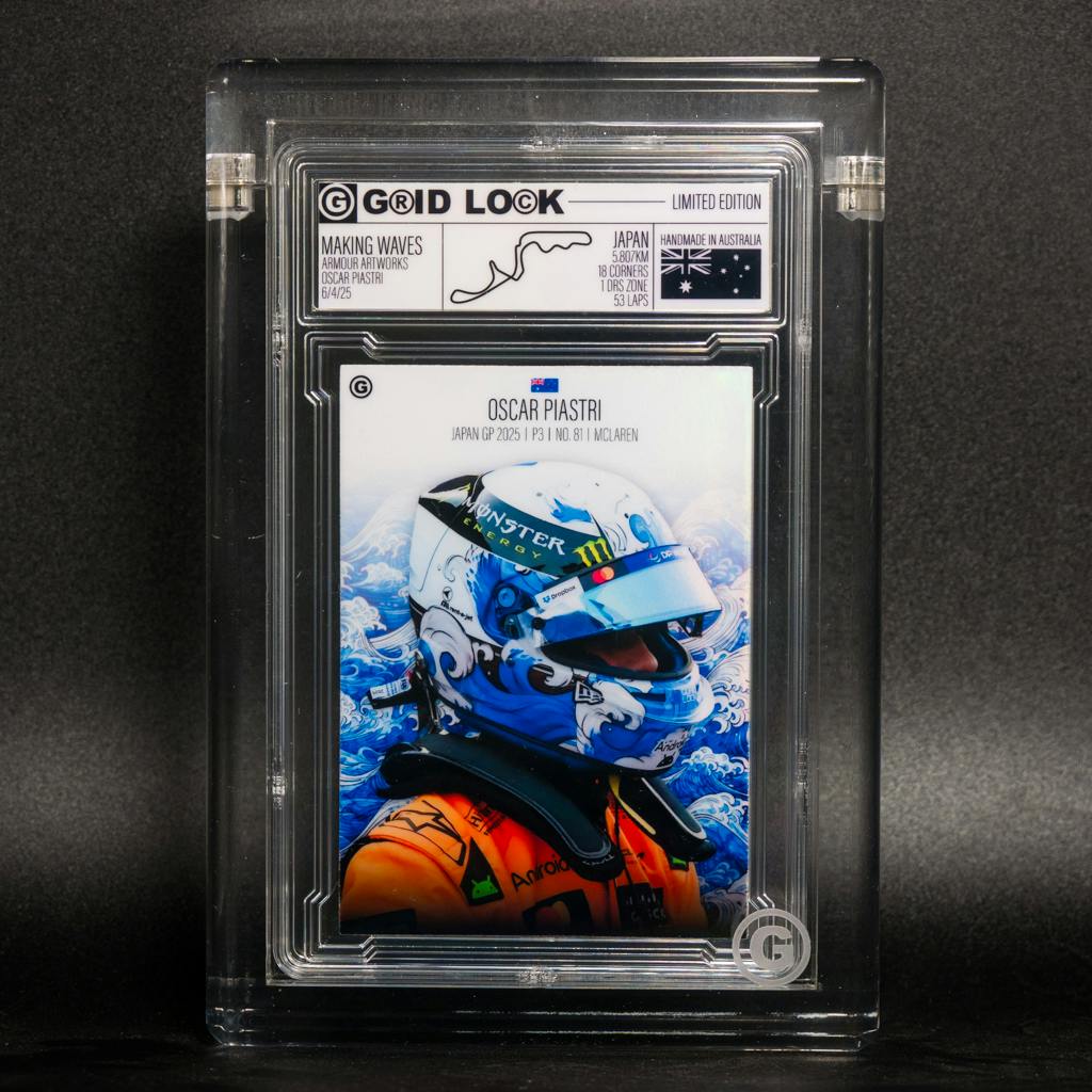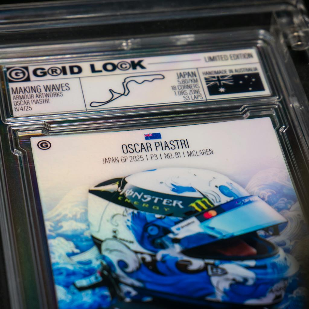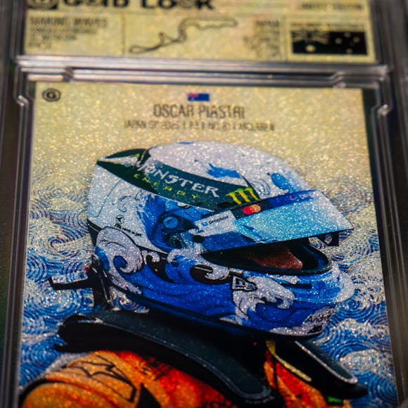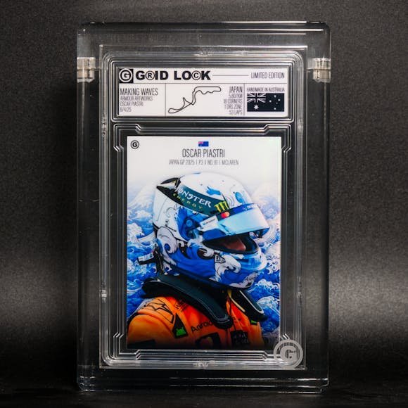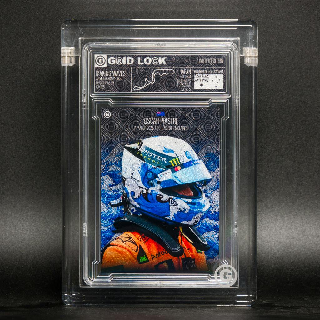 This piece showcases Oscar Piastri's stunning helmet from the 2025 Japan Grand Prix. These artworks are handmade in Australia and all unique in their own way. All cards come in an acrylic slab and magnetic case, packaged in a premium magnetic box with a certificate of authenticity and fabric gloves for handling to make your Grid Lock experience as special as possible, for you are now a part of an elite collectors group.