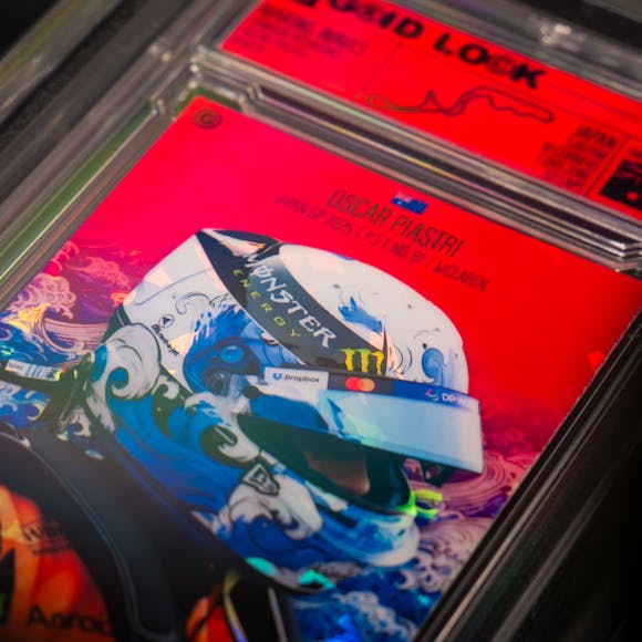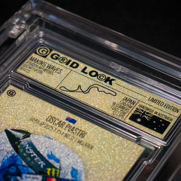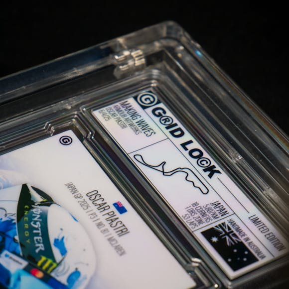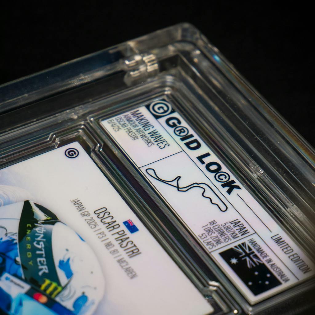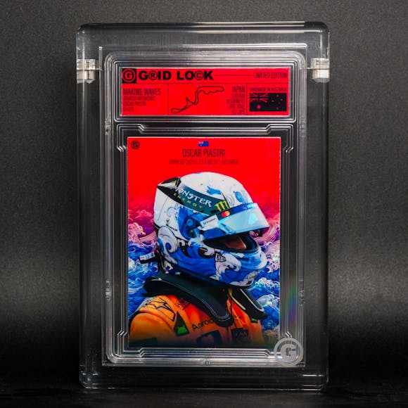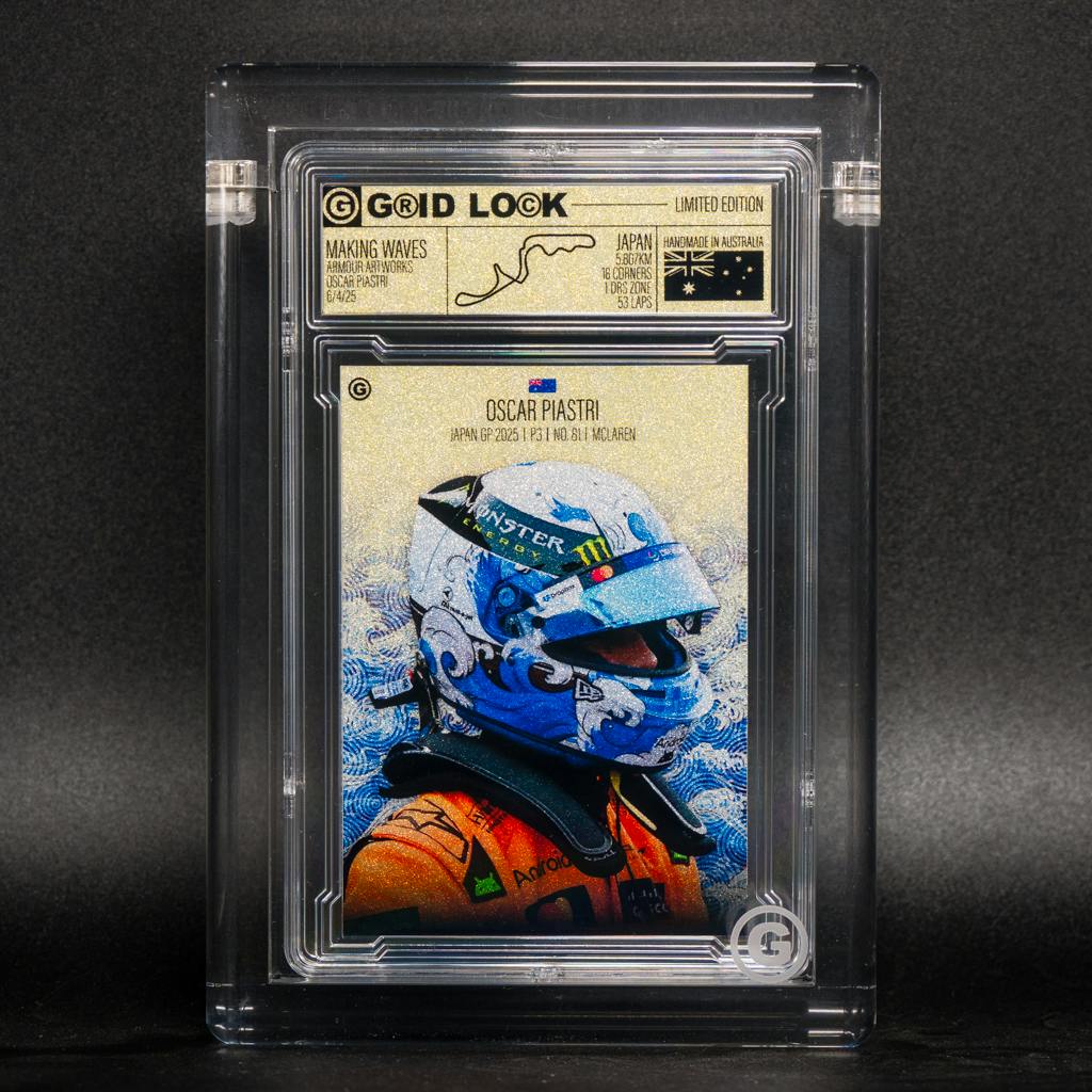This piece showcases Oscar Piastri's stunning helmet from the 2025 Japan Grand Prix. These artworks are handmade in Australia and all unique in their own way. All cards come in an acrylic slab and magnetic case, packaged in a premium magnetic box with a certificate of authenticity and fabric gloves for handling to make your Grid Lock experience as special as possible, for you are now a part of an elite collectors group.